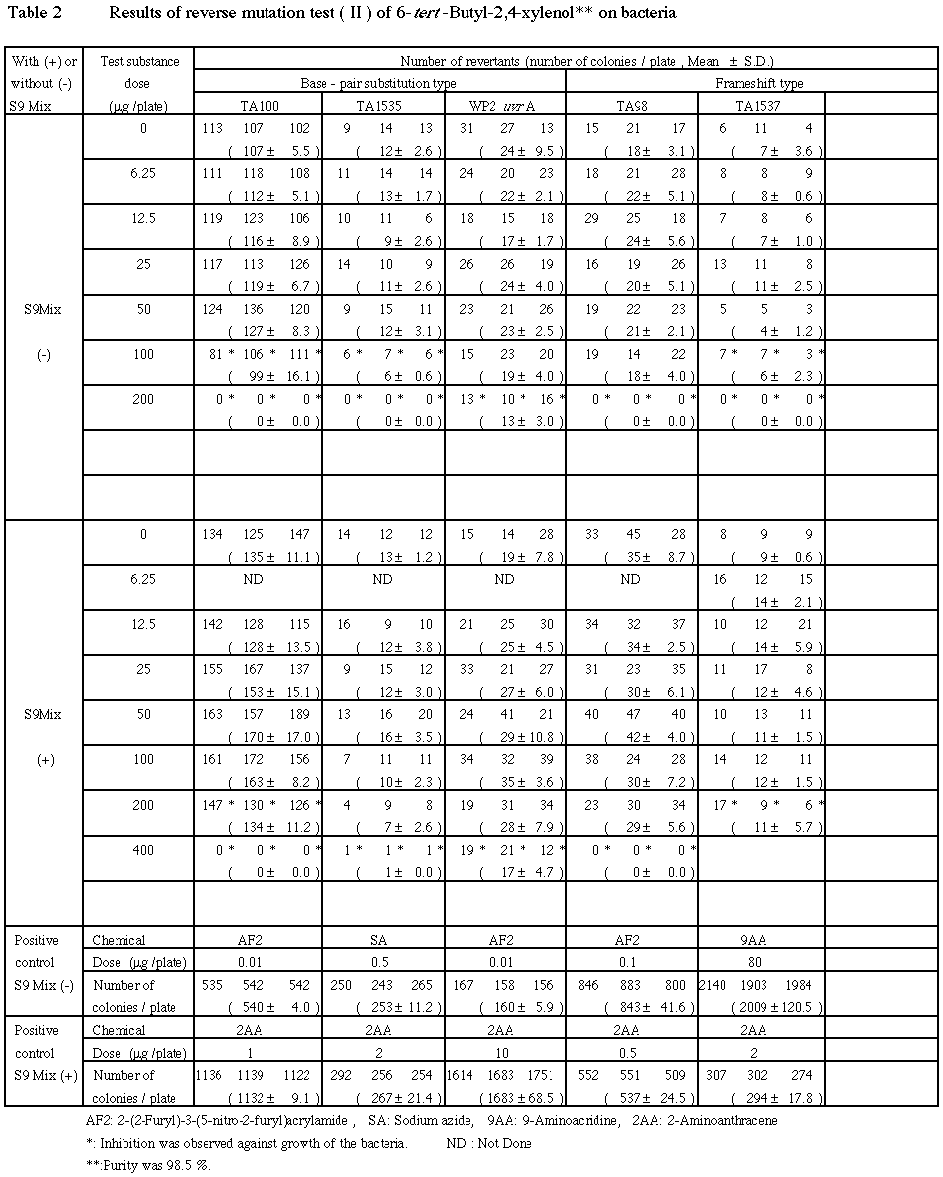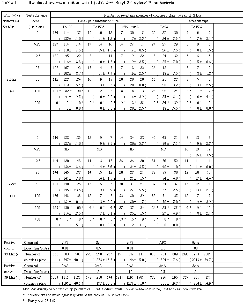 以上の結果に基づき,6-tert-ブチル-2,4-キシレノールは,用いた試験系において変異原性を有しないもの(陰性)と判定した.