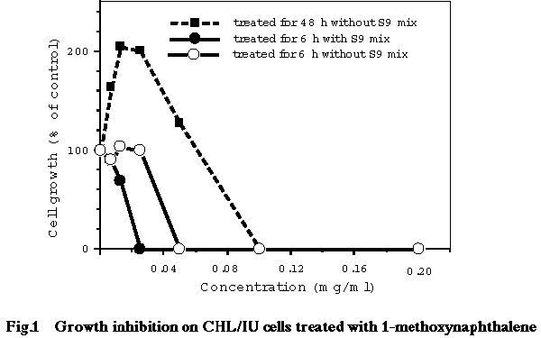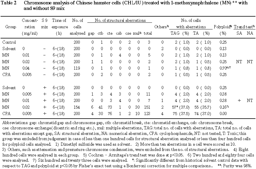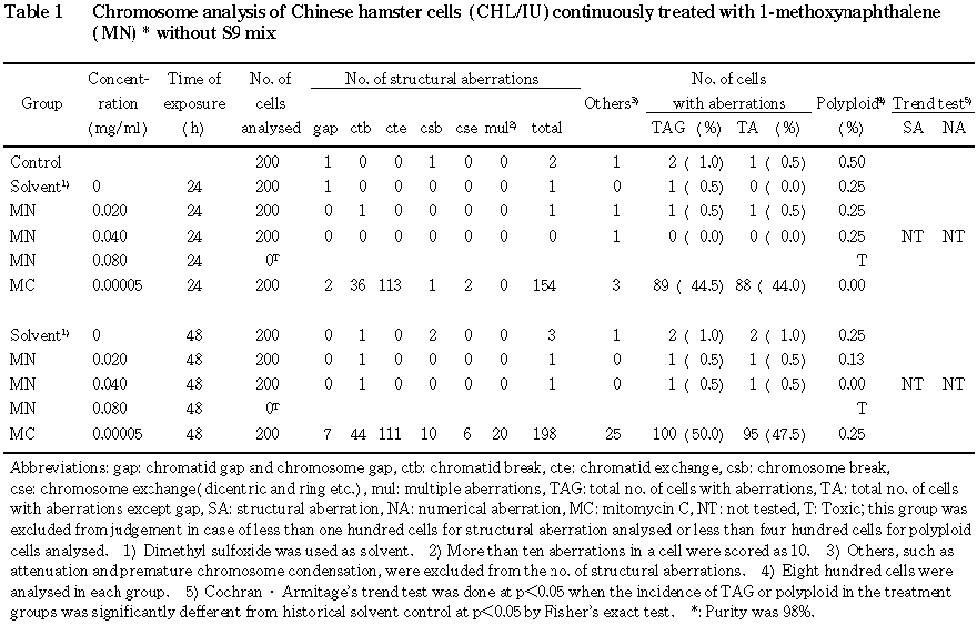 従って, 1-メトキシナフタレンは,上記の試験条件下で,試験管内のCHL/IU細胞に染色体異常を誘発すると結論した.