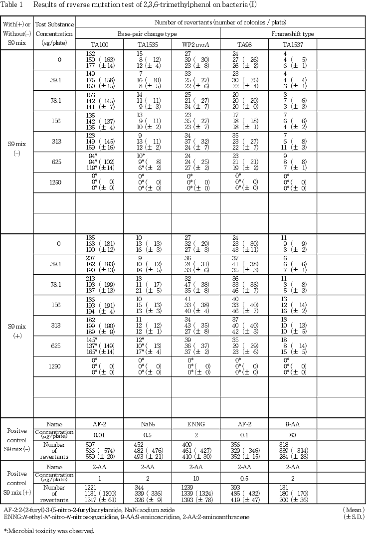 以上の結果から,2,3,6-トリメチルフェノールは本試験系において変異原性を有さない(陰性)と結論した.