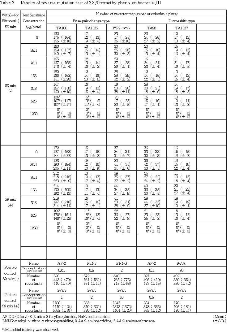 本試験を2回実施した結果,被験物質の各濃度において誘発された復帰変異コロニー数は,S9 mixの有無によらず,いずれの菌株においても陰性(溶媒)対照値の2倍以上を示さなかった.また,S9 mix非共存下および共存下のTA100,TA1535は625 μg/plate以上,WP2 uvrA,TA98,TA1537は1250 μg/plateで抗菌性が認められた.従って2,3,6-トリメチルフェノールは本試験系において変異原性を有さない(陰性)と結論した.