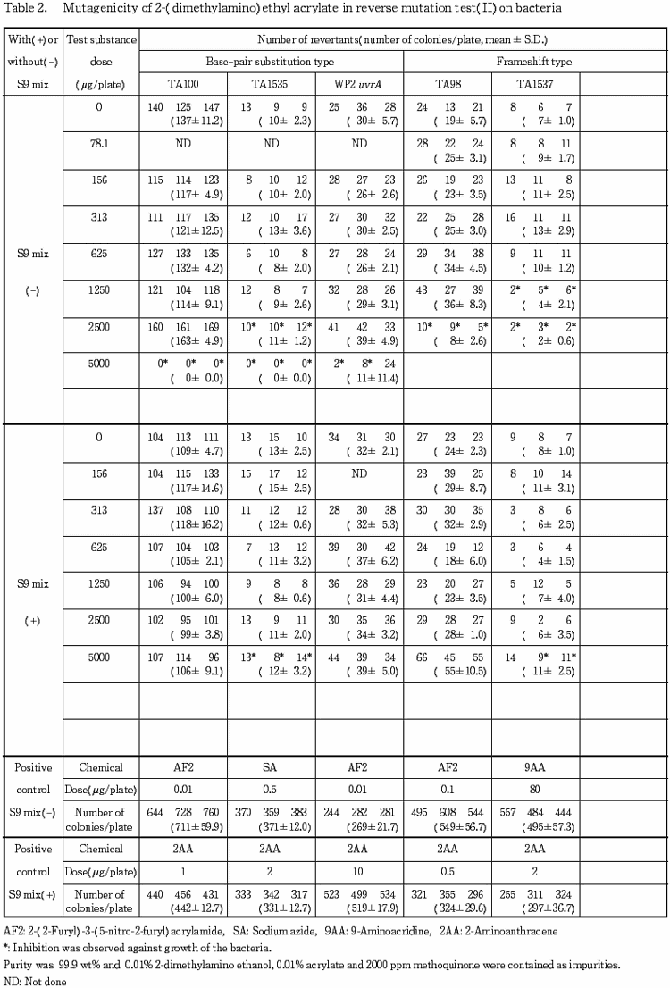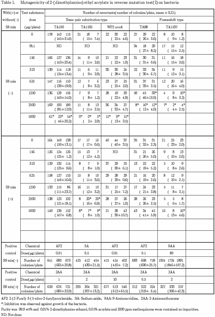 以上の結果から,アクリル酸 2-(ジメチルアミノ)エチルエステルは,用いた試験系において変異原性を有する(陽性)と判定された.