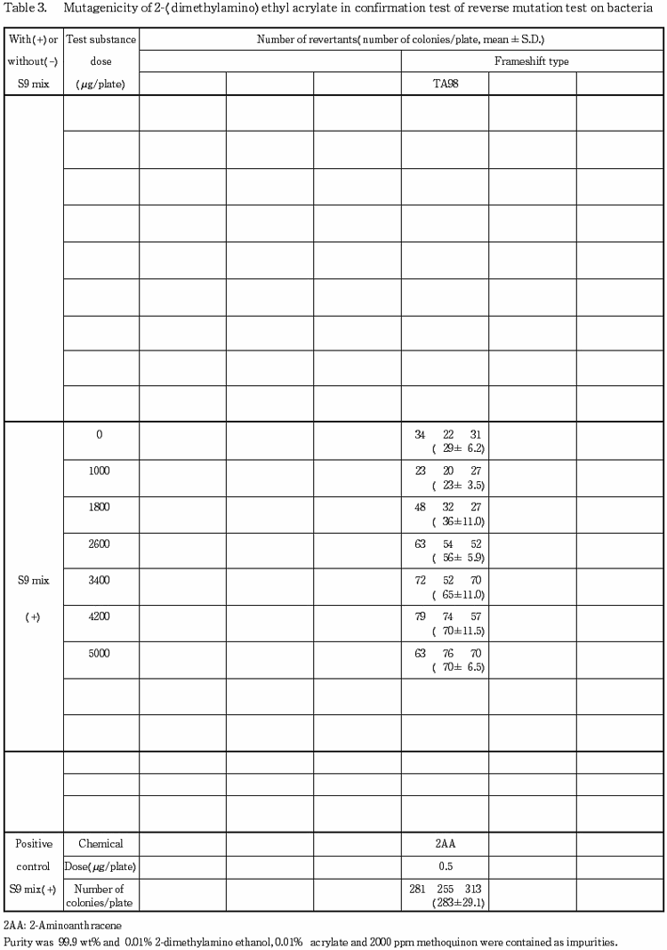 以上の結果に基づき,アクリル酸 2-(ジメチルアミノ)エチルエステルは,用いた試験系において変異原性を有する(陽性)と判定した.