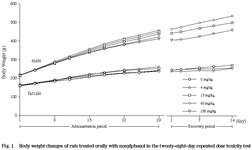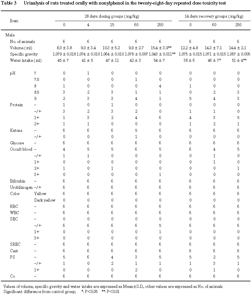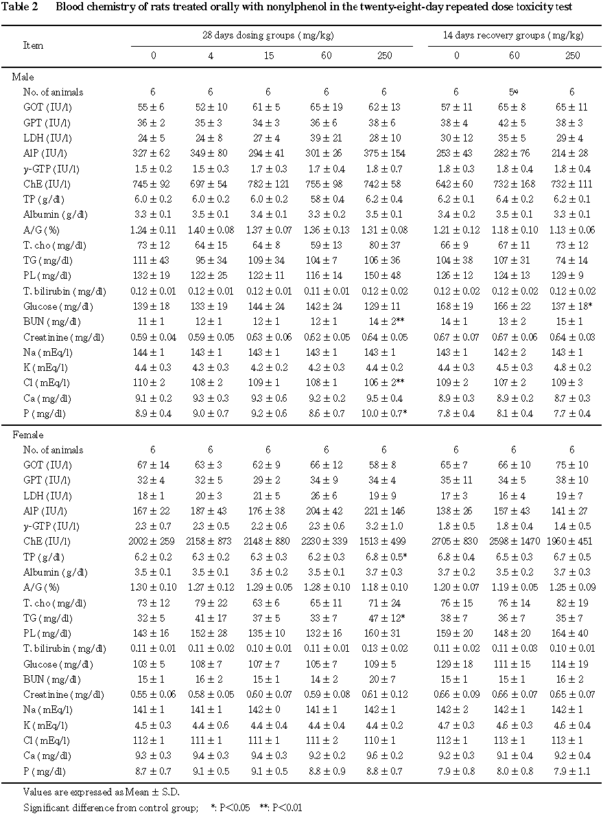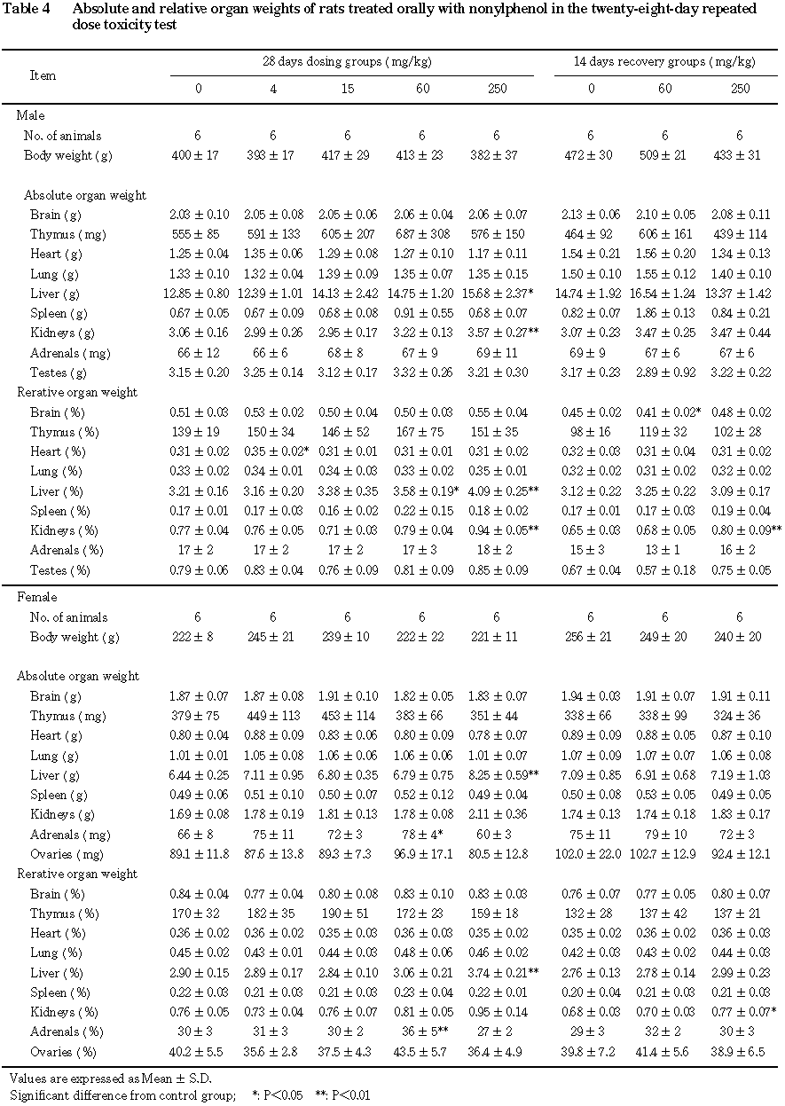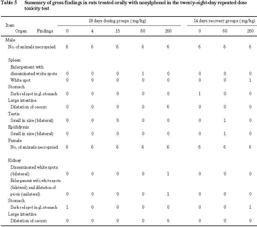以上の結果から,本試験条件下におけるノニルフェノールの無影響量は雄で 15 mg/kg/day,雌で60 mg/kg/dayと考えられた.