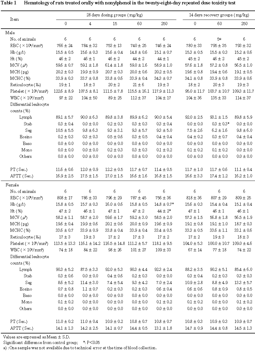 血液学検査では, 250 mg/kg群の雌にヘモグロビンとヘマトクリット値の低下が認められ,赤血球に対する影響が示唆された.