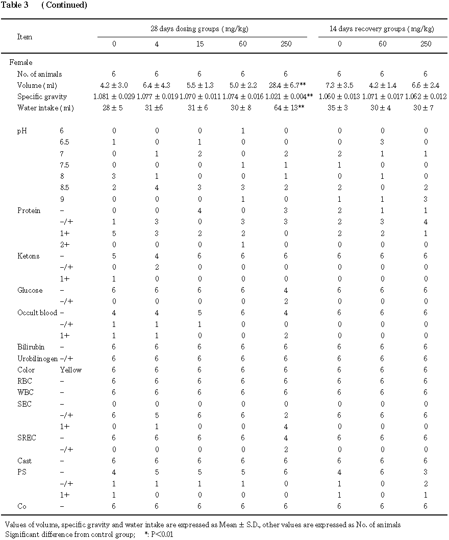 尿検査では,尿量の増加と比重の低下が 250 mg/kg群の雌雄に,摂水量の増加,沈渣中への扁平上皮細胞の増加と小円形上皮細胞の出現が250 mg/kg群の雌に,血液学検査では,ヘモグロビンとヘマトクリット値の減少が250 mg/kg群の雌に,血液生化学検査では,尿素窒素および無機リンの増加と塩素の減少が250 mg/kg群の雄に,総蛋白およびトリグリセライドの増加が250 mg/kg群の雌にみられた.