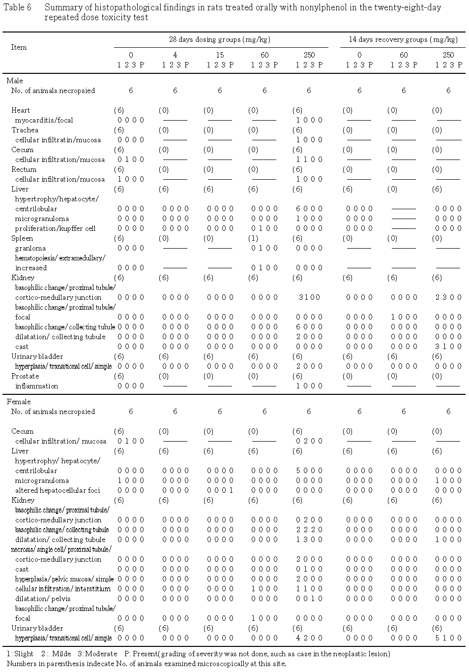 以上の如く,ノニルフェノールをラットに 28日間反復投与した結果,主な変化が250 mg/kg群の腎臓,膀胱および肝臓にみられ,本被験物質の標的器官は腎臓,膀胱および肝臓と考えられた.また,60 mg/kg群では,肝臓相対重量の増加がみられたが,15 mg/kg以下の投与群では変化は認められなかった.これらの結果から,本試験条件下におけるノニルフェノールの無影響は雄では15 mg/kg/day,雌では60 mg/kg/dayと考えられた.