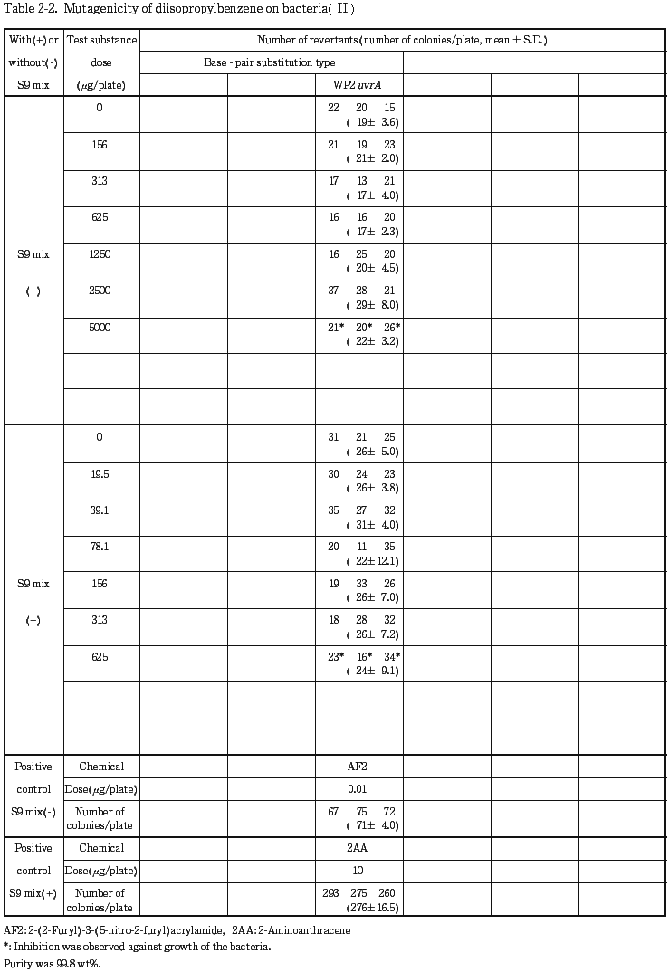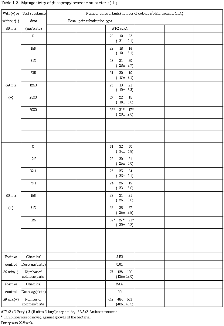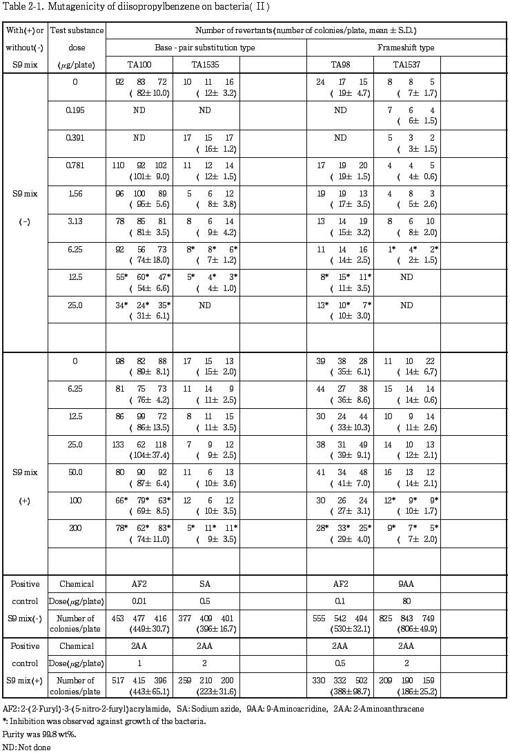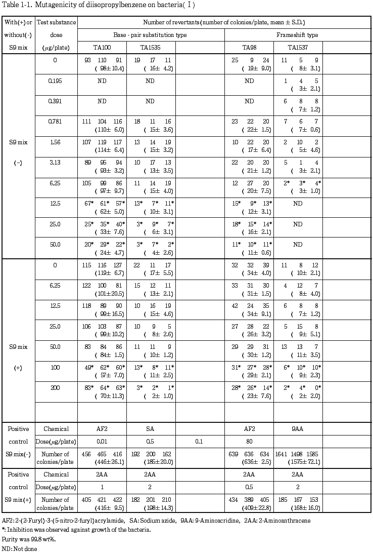 以上の結果から,ジイソプロピルベンゼンは,用いた試験系において変異原性を有しないもの(陰性)と判定した.