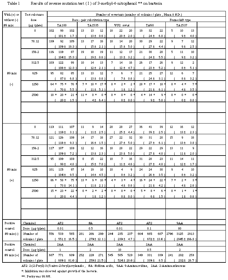 その結果,それぞれ2回実施した本試験において,用いた5種類の検定菌とも,いずれの用量でも復帰変異コロニー数の増加が認められなかったことから,3-メチル-4-ニトロフェノールは,用いた試験系において変異原性を有しない(陰性)と判定された.