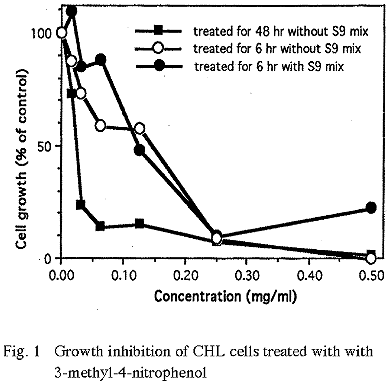 その結果,3-メチル-4-ニトロフェノールの約50%の増殖抑制を示す濃度を,50%をはさむ2濃度の値より算出したところ,直接法では0.023mg/mlであった.一方,代謝活性化法のS9mix存在下および非存在下における約50%の増殖抑制を示す濃度は,それぞれ0.12mg/mlおよび0.15mg/mlであった(Fig.1).