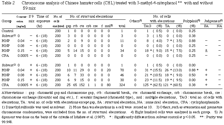 以上の結果より,3-メチル-4-ニトロフェノールは,今回実施した試験条件下で,試験管内のCHL細胞に染色体異常を誘発すると結論した.