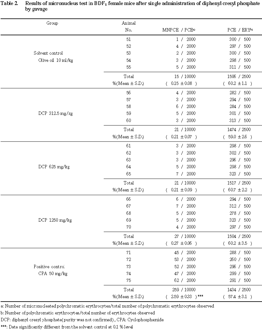 以上の結果から,リン酸ジフェニルクレジルは,本試験条件下で Crj:BDF1雄および雌マウスの骨髄細胞において,小核誘発作用を示さないと結論した.