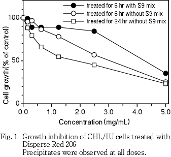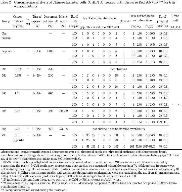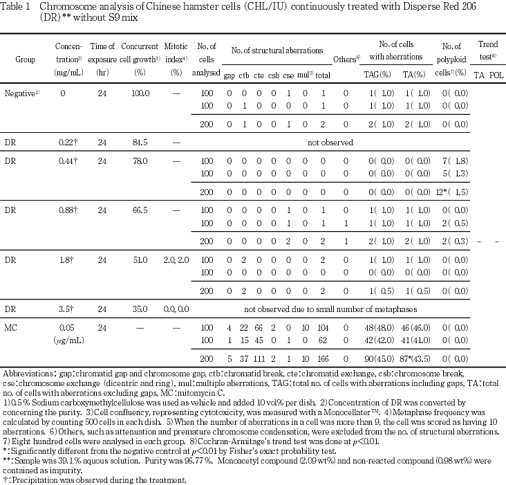 以上の結果より,本試験条件下でディスパーズレッド206は,染色体異常を誘発する(陽性)と結論した.