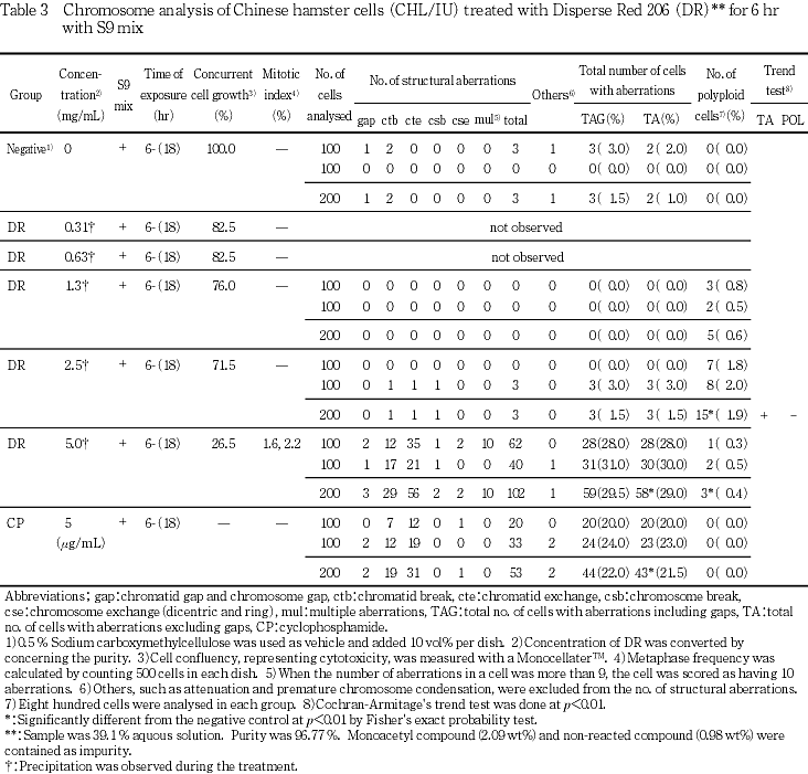 以上の結果より,ディスパーズレッド206は,本試験条件下でCHL/IU細胞に染色体異常を誘発すると結論した.