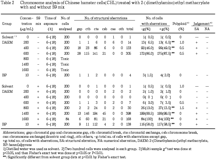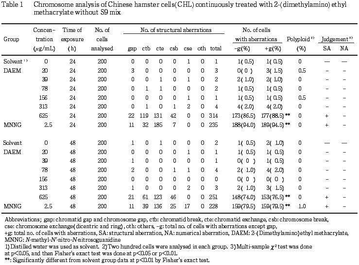 以上の成績から,本実験条件下において,2-(ジメチルアミノ)エチルメタクリラートは,CHL細胞に対し染色体異常を誘発する(陽性)と結論した.