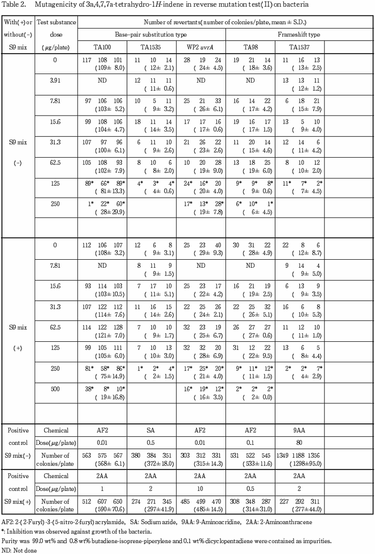 検定菌として,Salmonella typhimurium TA100,TA1535,TA98,TA1537 1)および Escherichia coli WP2 uvrA 2,3)の5菌株を用い,S9 mix 無添加および添加試験のいずれも,用量設定試験で抗菌性が認められたことから,本試験は S9 mix 無添加試験および添加試験ともに,78.1〜250μg/プレートの範囲(TA1535 および TA1537 では S9 mix 無添加試験は 3.91〜125μg/プレート,添加試験は 7.81〜250μg/プレート)で実施した.その結果,2回の本試験とも,用いた5種類の検定菌のいずれの用量においても,溶媒対照値の2倍以上となる再現性のある復帰変異コロニー数の増加は認められなかった.以上の結果から,3a,4,7,7a-テトラヒドロ-1H-インデンは,用いた試験系において変異原性を有しない(陰性)と判定された.