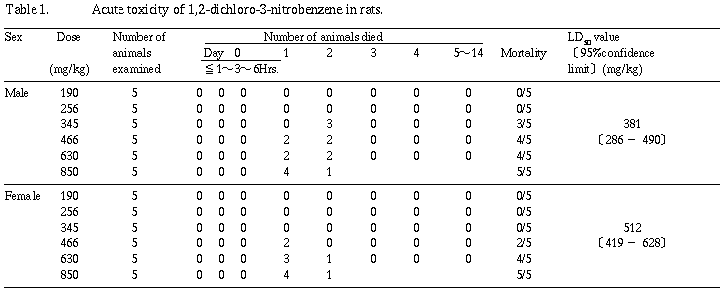 1,2−ジクロロ−3−ニトロベンゼンの急性毒性試験を、SD系〔Crj:CD (SD)〕ラットを1群雌雄各5匹とし、1,2−ジクロロ−3−ニトロベンゼンの190、256、345、466、630および850 mg/kg(公比1.35)用量を単回経口投与して実施した。投与後14日間の死亡率から計算されたLD50値(95%信頼限界)は、雄で381(286−490)mg/kg、雌で512(419−628)mg/kgであった。投与後の一般症状としては、自発運動の低下、眼瞼下垂、よろめき歩行、全身筋肉の弛緩および皮膚の蒼白化が雌雄に、呼吸の深大化が雄に、いずれも用量依存的に認められた。死亡動物は、上記症状が重度化し、呼吸が微弱となって投与後1〜2日に死亡した。生存動物は、投与後6時間から3日の間に回復した。体重は、雌雄とも投与後1日には減少ないし増加抑制がみられたが、症状が回腹した3〜7日以降は順調な増加が認められた。死亡動物の剖検では、雌雄の一部の例で、散在性の黒色点が胃の腺胃部粘膜に認められ、胃および腸内容物は黒色化していた。また、膀胱内に被験物質由来と考えられる潜血反応陰性の褐色尿や黒褐色塊状物が認められた。しかし、死因が推定できるような高率、かつ、重度な臓器の変化は認められなかった。生存動物の剖検では、著変は認められなかった。