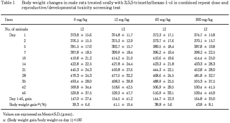 試験群は,3,5,5-トリメチルヘキサン-1-オールの100,300および1000 mg/kgを雌雄各5例に14日間反復経口投与した用量設定試験の結果を参考に設定した.すなわち,1000 mg/kg群では死亡あるいは衰弱による屠殺が雄で5例中4例,雌で5例全例にみられ,300 mg/kg群で体重増加抑制,摂餌量の低値,肝臓の体重重量比の高値および性周期の異常が,100 mg/kg群で肝臓の体重重量比の高値が認められた.本試験では投与期間が用量設定試験の約3倍になることを勘案し,高用量は明らかな毒性徴候がみられる用量として300 mg/kg群とし,以下公比5で60および12 mg/kgを設定した.さらに,媒体であるオリーブ油を投与する対照群を加えて計4群とし,動物数は1群当たり雌雄各12匹を用いた.群分けは,投与開始前日に投与開始前々日の体重値をもとに各群の体重が均一になるように体重別層化無作為抽出法を用いて行った.なお,生殖能検査における交配期間中の腟スメア標本の観察で12 mg/kg群の雌1例の妊娠期日の判定および投与容量の算定誤りが生じたため,同例では交尾および妊娠の成立までのデータを採用し,妊娠期間以降については評価から除くこととした.