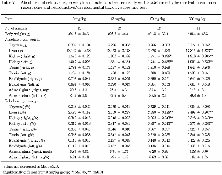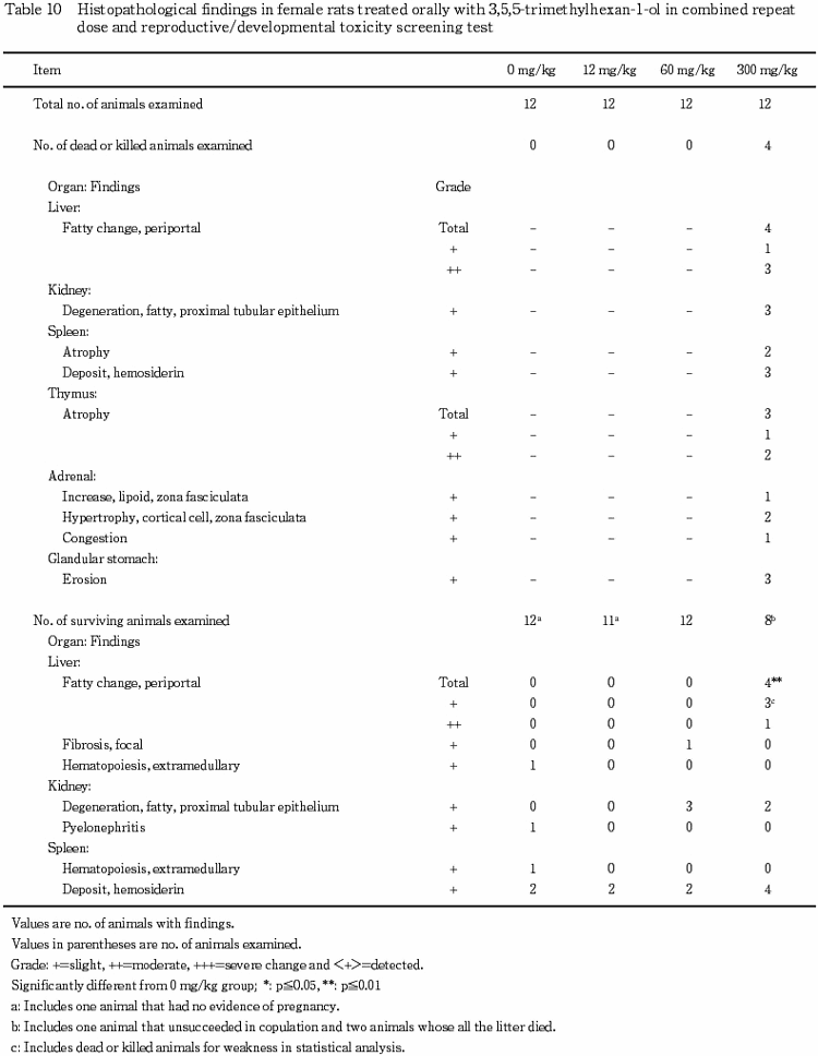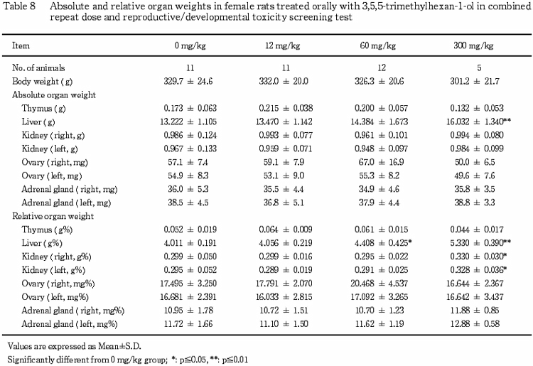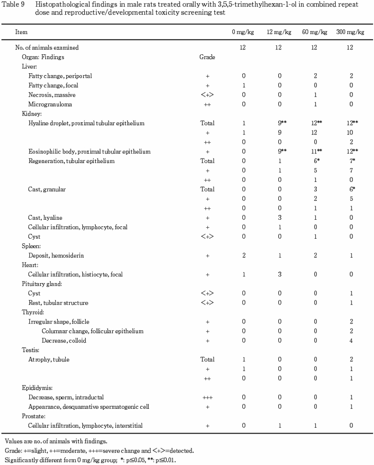 他に,病理組織学検査では雄の300 mg/kg群で甲状腺に濾胞の不整形,濾胞上皮の円柱化およびコロイドの減少が,雌では300 mg/kg群で胸腺の萎縮が認められ,3,5,5-トリメチルヘキサン-1-オール投与の影響と考えられた.