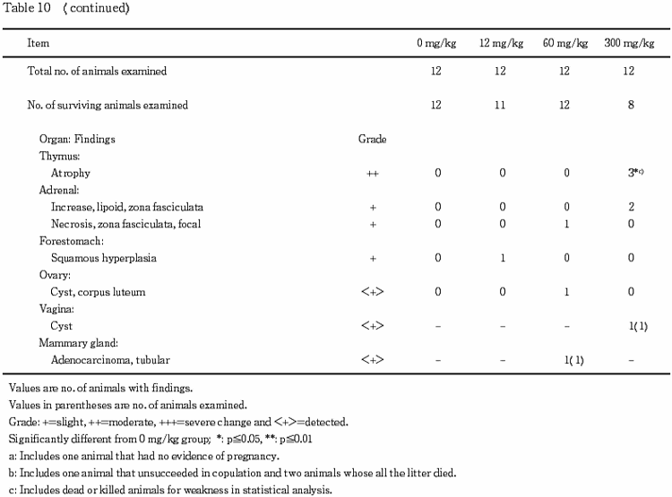 雌では,死亡あるいは切迫屠殺例において,肝臓で軽度あるいは中等度の小葉周辺性脂肪化が4例全例に,胸腺で軽度あるいは中等度の萎縮が3例に認められ,計画屠殺例も含めた発現例数に有意差が認められた.腎臓では尿細管上皮の軽度の脂肪変性が3例に,脾臓では軽度の萎縮が2例,軽度のヘモジデリン沈着が3例に,副腎では束状帯における軽度のリポイド増加が1例,束状帯における軽度の皮質細胞肥大が2例,うっ血が1例に,腺胃では軽度のびらんが3例に認められた.雌の哺育4日屠殺例および全哺育児死亡例では,300 mg/kg群において肝臓に軽度あるいは中等度の小葉周辺性脂肪化ならびに胸腺に中等度の萎縮がそれぞれ3例に認められた.腎臓では尿細管上皮の軽度の脂肪変性が60 mg/kg群の3例および300 mg/kg群の全哺育児死亡例2例に認められた.また,脾臓ではヘモジデリン沈着が対照群,12 mg/kg群および60 mg/kg群で各2例に,300 mg/kg群で4例に認められ,途中屠殺例も含めて300 mg/kg群で多い傾向がみられたが,発現例数に有意差は認められなかった.なお,300 mg/kg群の全哺育児死亡例の2例では,副腎の束状帯で軽度のリポイド増加も認められた.300 mg/kg群の交尾不成立例1例では肝臓に軽度の小葉周辺性脂肪化が認められた.
