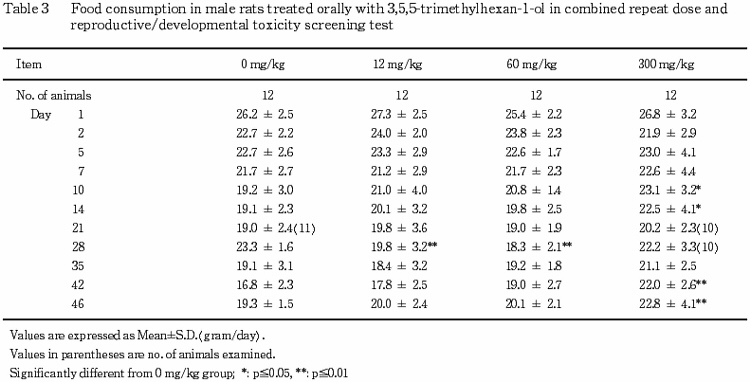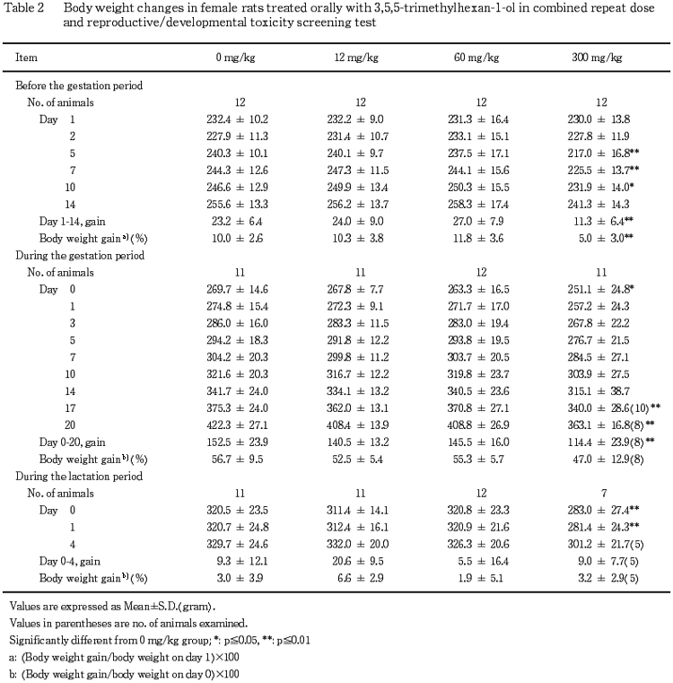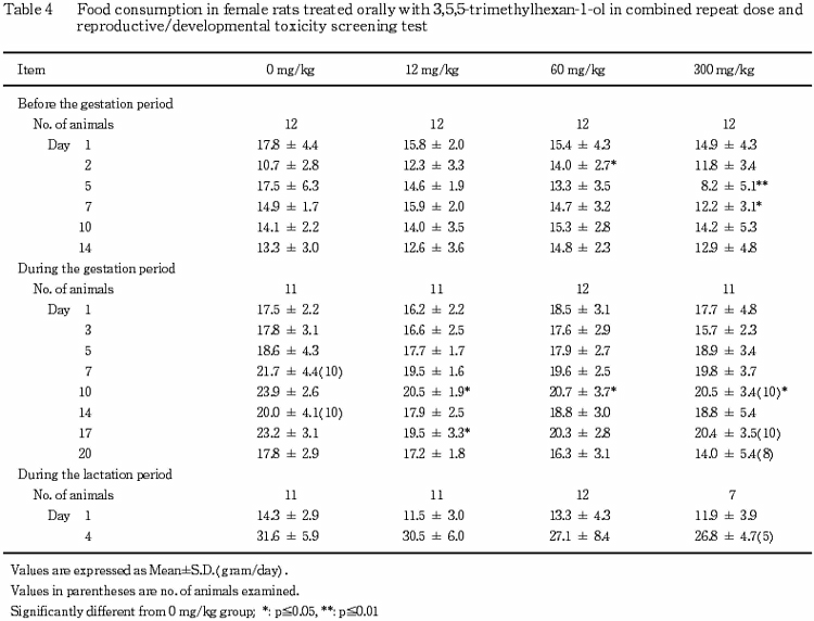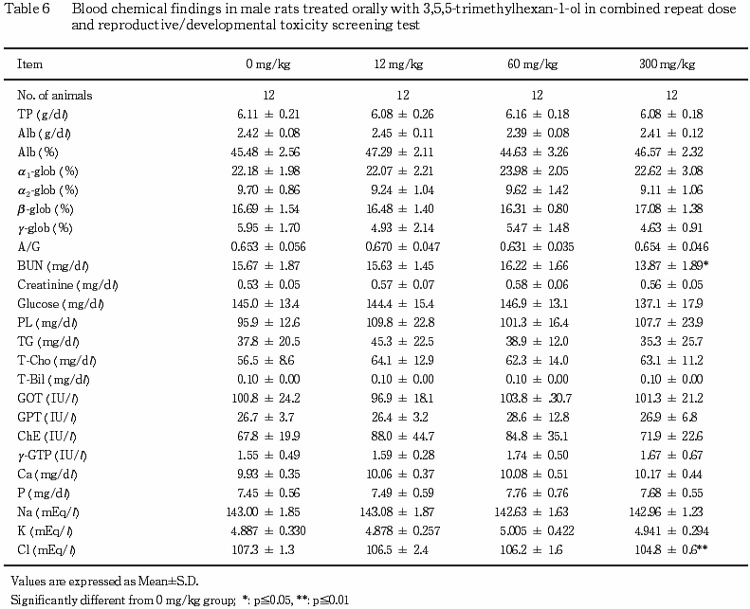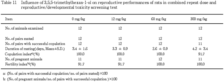 以上,雄動物の生殖能に対しては300 mg/kg群においても影響は認められなかったが,雌では300 mg/kg群で発情休止期の継続および全哺育児死亡例がみられたこと,60 mg/kg以上の群で着床率の低値ならびにそれに起因すると考えられる出産生児数の低値が認められたことから,本試験における3,5,5-トリメチルヘキサン-1-オールの雄動物の生殖に対する無影響量は300 mg/kg/day,雌動物の生殖に対する無影響量は60 mg/kg/day,次世代の発生に対する無影響量は12 mg/kg/dayであると判断された.