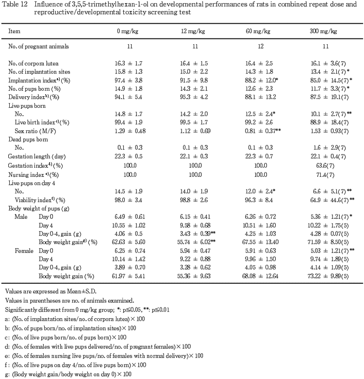 以上のことから,雄動物の生殖能に対する影響は300 mg/kg群でも認められなかったが,300 mg/kg群の雌において発情休止期の継続および前哺育児死亡例がみられたこと,60 mg/kg以上の群で着床率の低値ならびにそれに起因すると考えられる出産生児数の低値が認められたことから,本試験における3,5,5-トリメチルヘキサン-1-オールの親世代の生殖に対する無影響量は雄で300 mg/kg/day,雌で60 mg/kg/day,次世代の発生に対する無影響量は12 mg/kg/dayであると判断された.