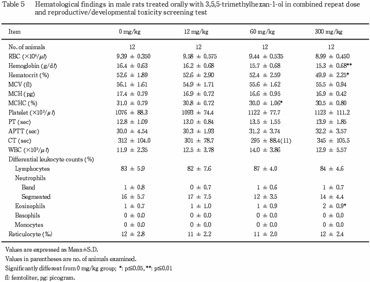 血液学検査では,雄の300 mg/kg群でヘマトクリット値および血色素量の減少,ならびに赤血球数の減少傾向が認められ,3,5,5-トリメチルヘキサン-1-オール投与による影響と考えられ,網赤血球率や脾臓の病理組織学検査に異常のないことから,軽度の貧血と考えられた.