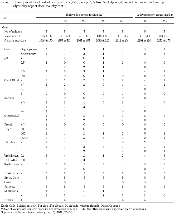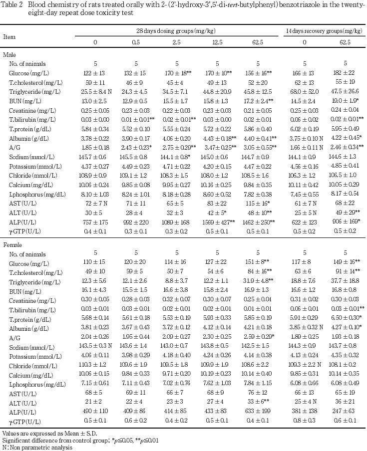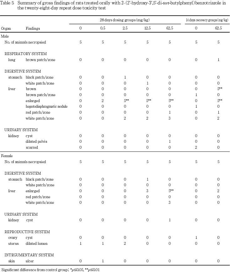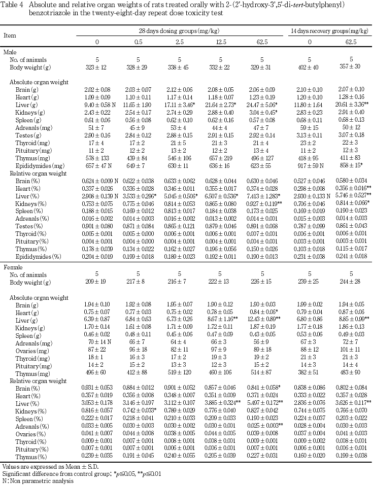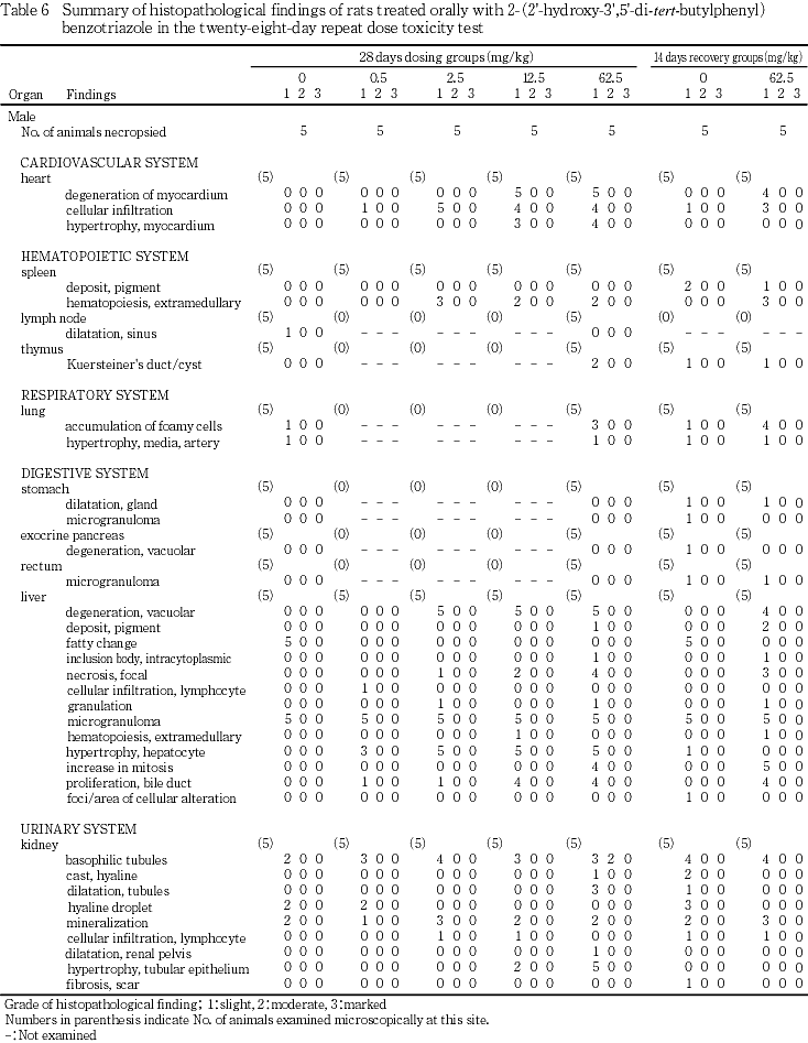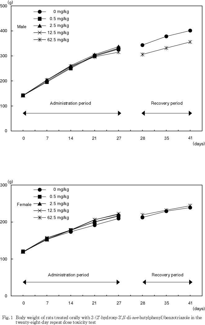 以上の結果,本試験条件下における2-(2'-ヒドロキシ-3',5'-ジ-tert-ブチルフェニル)ベンゾトリアゾールの無影響量は,雌では12.5 mg/kg群で肝臓の絶対重量および相対重量の高値,肝臓の肥大,肝細胞肥大が認められたことから2.5 mg/kg/day,また,雄では0.5 mg/kg群で肝臓絶対重量の高値傾向および相対重量の高値,肝臓の肥大,肝細胞肥大が認められたことから0.5 mg/kg/day未満と判断された.