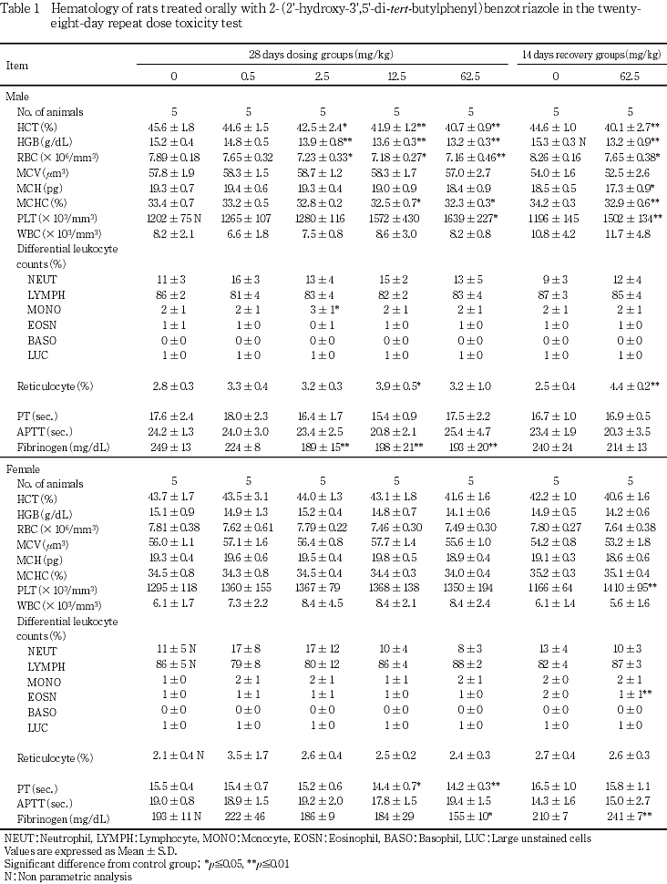 血液学検査では,2.5 mg/kg以上の群の雄でヘマトクリット値,ヘモグロビン量および赤血球数が低値を示した.さらに,12.5 mg/kg以上の群の雄でMCHCが低値を示した.また,62.5 mg/kg群の雄では血小板数が高値を示しており,いずれも被験物質の影響と考えられた.回復期間終了時にも62.5 mg/kg群の雄でヘマトクリット値,ヘモグロビン量,赤血球数,MCHおよびMCHCが低値,網赤血球比率が高値を示した.また,62.5 mg/kg群の雌雄で血小板数が高値を示しており,休薬しても回復を示さないものと考えられた.