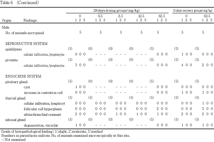 解剖所見では,被験物質の影響を示唆する病変として,投与期間終了時において,肝臓の肥大が0.5 mg/kg以上の群の雄および12.5 mg/kg以上の群の雌,白色斑/区域が2.5 mg/kg以上の群の雄および62.5 mg/kg群の雌に観察され,回復期間終了時においても同様の所見が62.5 mg/kg群において観察された.病理組織所見では,投与期間終了時において心臓の心筋変性,細胞浸潤および心筋肥大が雌雄に,脾臓の髄外造血が雄に,肝臓において小葉辺縁部の肝細胞の空胞変性,肝細胞肥大,分裂像増多および胆管増殖が雌雄に,巣状壊死が雄に,腎臓の尿細管好塩基化の程度の増強が雄に,管腔拡張が雄に,集合管の尿細管上皮肥大が雌雄に,甲状腺の濾胞細胞増生が雌雄に観察された.回復期間終了時の62.5 mg/kg群において,投与終了時に観察された同様の諸所見が心臓,脾臓,肝臓および甲状腺に観察された.