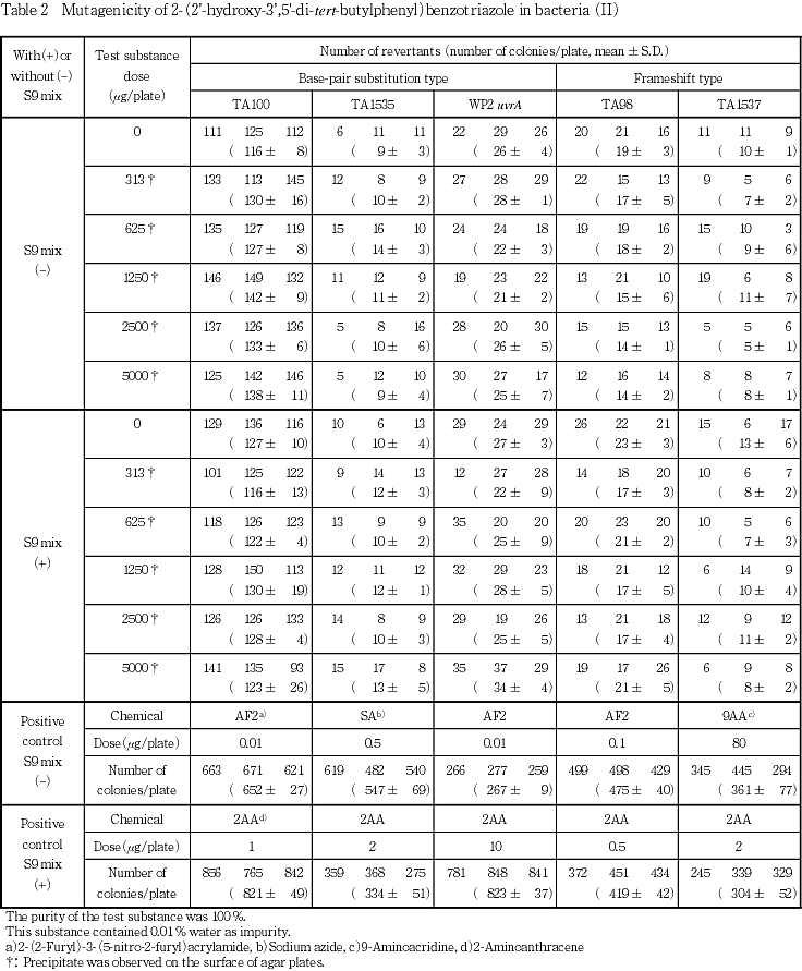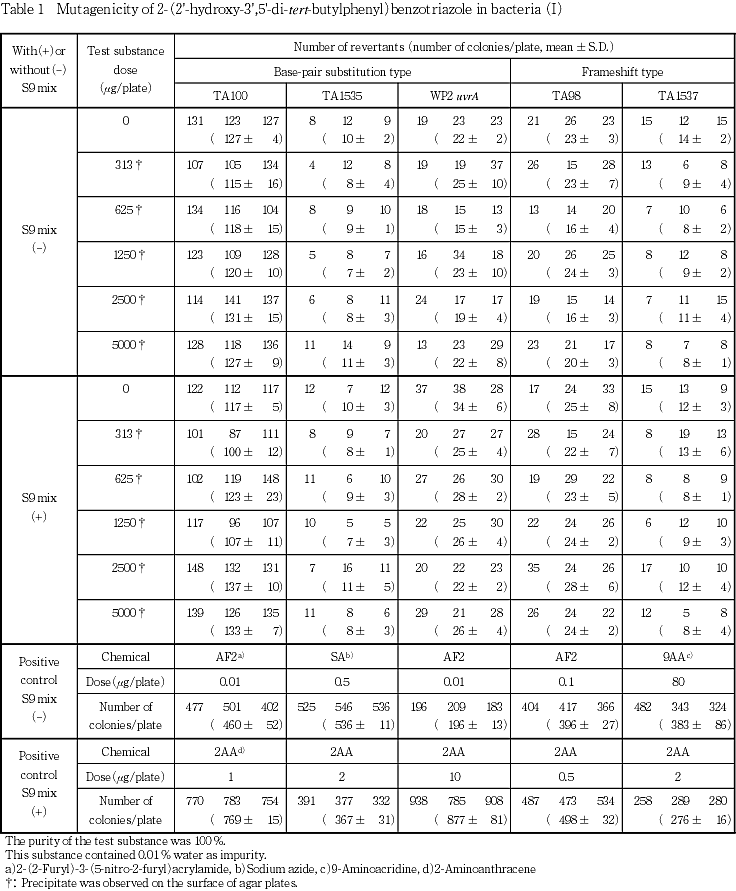 以上の結果から2-(2'-ヒドロキシ-3',5'-ジ-tert-ブチルフェニル)ベンゾトリアゾールは,用いた試験系において変異原性を有しないもの(陰性)と判定した.
