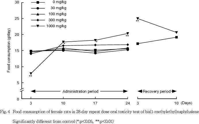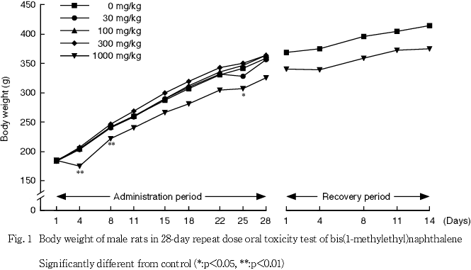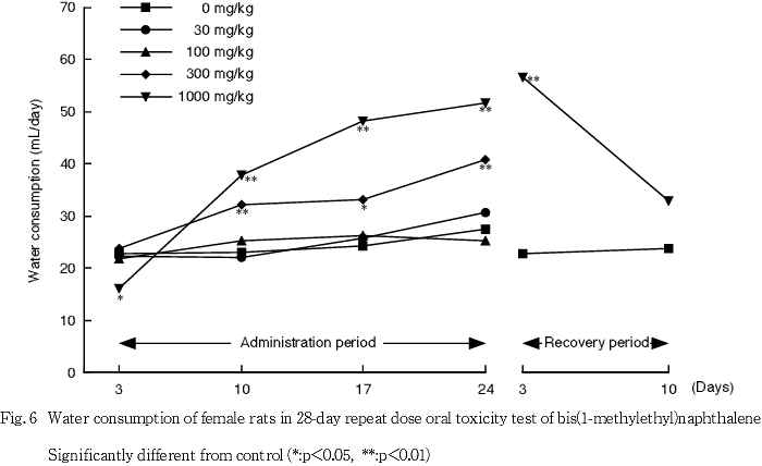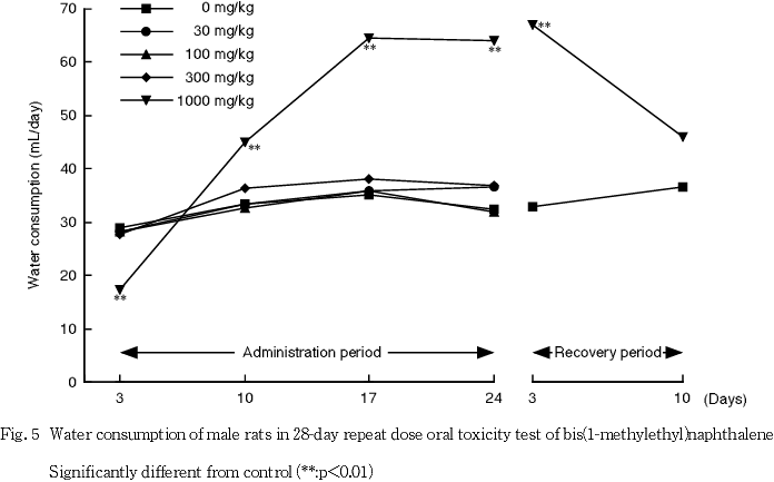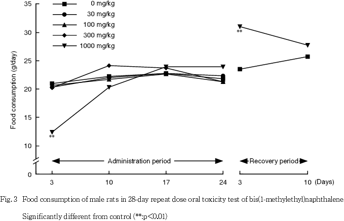 1000 mg/kg群の雌雄で投与期間の初期に体重増加の抑制,摂餌量および摂水量の低値がみられ,ビス(1-メチルエチル)ナフタレンは1000 mg/kg投与で死亡発現を含めて全身状態の悪化を来すと考えられる.しかし,300 mg/kg群の雌で投与期間の中期〜後期に摂水量の高値が,1000 mg/kg群の雌で投与期間の中期〜後期に摂餌量の高値が,1000 mg/kg群の雌雄で投与期間の中期〜後期に摂水量の高値がみられ,摂餌量および摂水量は逆に増加した.また,回復期間中は,1000 mg/kg群の雌雄とも摂餌量の高値および摂水量の高値が引き続いてみられた.なお,一般状態観察において,100 mg/kg以上の群の雌雄で一過性の流涎がみられたが,被験物質の刺激性に基づく変化と判断され,毒性症状とはみなさなかった.