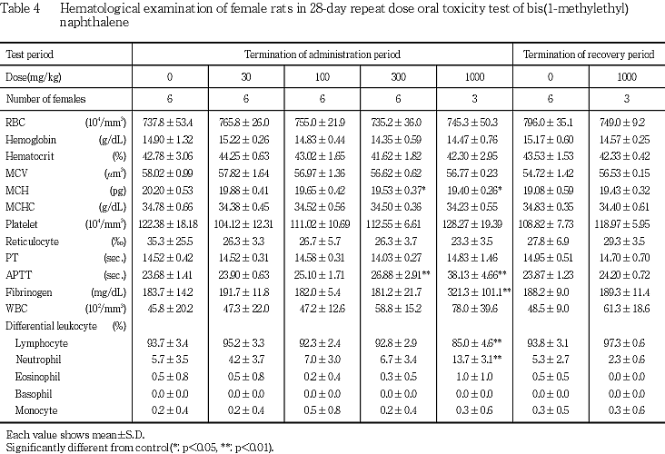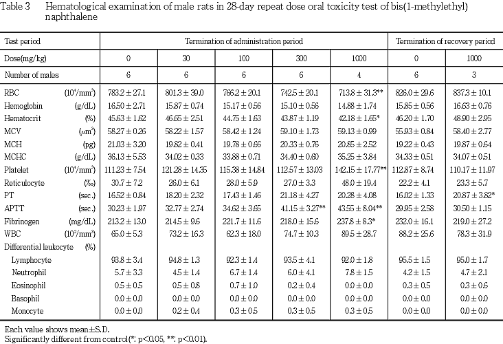 血液学検査では,300 mg/kg群の雄でAPTTおよびPTの高値あるいは高値傾向が,300 mg/kg群の雌でAPTTの高値が,1000 mg/kg群の雄で血小板数,PT,APTTおよびフィブリノーゲン濃度の高値あるいは高値傾向ならびに赤血球数およびヘマトクリット値の低値が,雌で白血球数,APTT,フィブリノーゲン濃度および好中球率の高値あるいは高値傾向ならびにリンパ球率の低値がみられた.これらの変動は,回復期間終了時にはほぼ消失したが,1000 mg/kg群の雄でPTの高値がみられた.