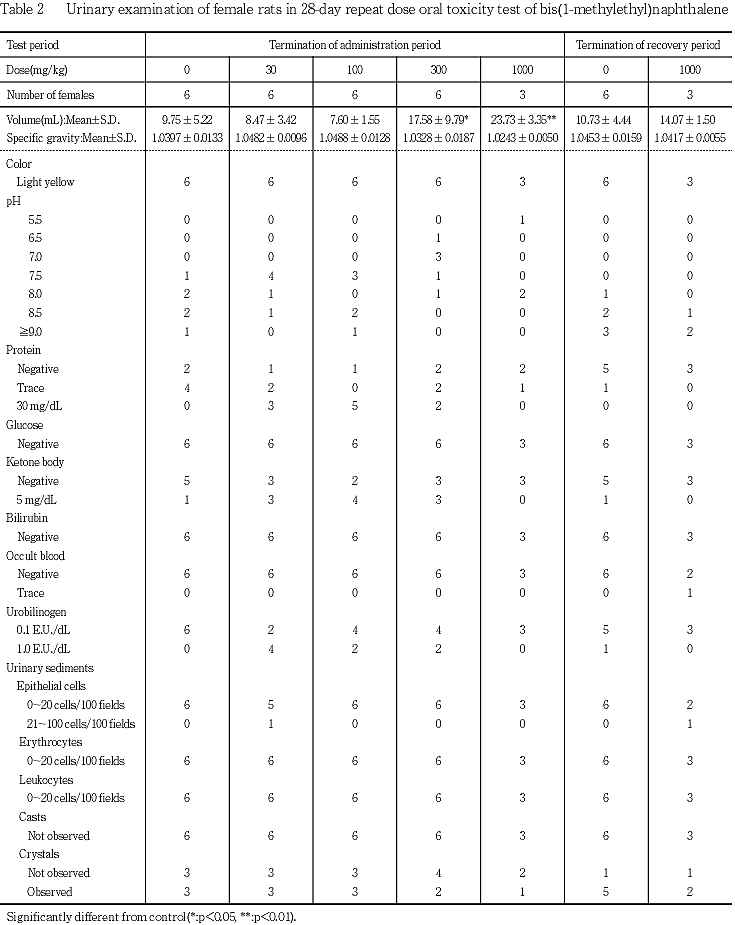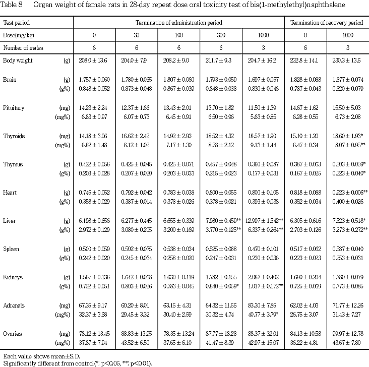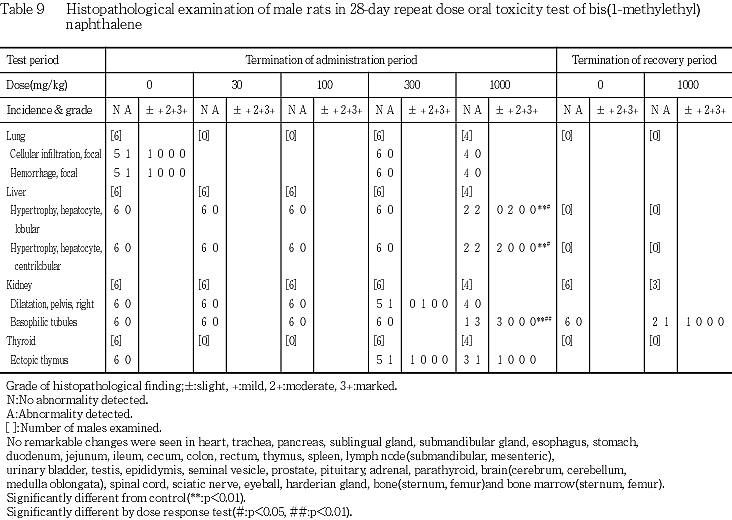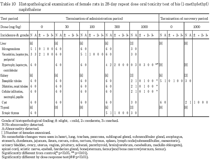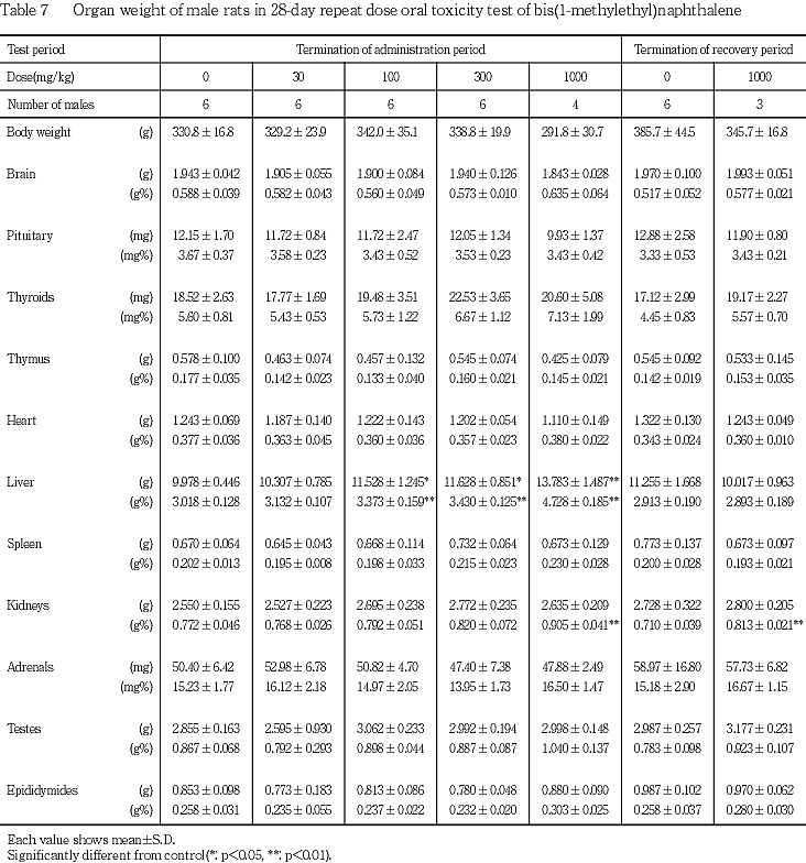 血液生化学検査において,30および100 mg/kg群の雌で総コレステロールの高値が,300 mg/kg群の雄で総ビリルビンの高値ならびにトリグリセライドの低値が,雌で総ビリルビンおよび総コレステロールの高値が,1000 mg/kg群の雄でGPT,γ-GTP,総ビリルビンおよび総コレステロールの高値あるいは高値傾向ならびにトリグリセライドの低値が,雌でGPT,γ-GTP,総ビリルビン,総コレステロールおよびトリグリセライドの高値がみられた.また,器官重量においても,100,300および1000 mg/kg群の雄ならびに300および1000 mg/kg群の雌で肝臓の絶対および相対重量の高値がみられた.病理組織学検査では,肝臓において300 mg/kg群で小葉中心性肝細胞肥大が雌に,1000 mg/kg群で小葉全体の肝細胞肥大が雄に,小葉中心性肝細胞肥大が雌雄にみられており,ビス(1-メチルエチル)ナフタレンは肝臓に影響を及ぼすと考えられる.なお,上記のように,トリグリセライドは,投与により雄では減少し,雌では増加したが,この原因は不明であった.また,1000 mg/kg群の雌で尿素窒素およびクレアチニンの高値傾向がみられ,1000 mg/kg群の雄で腎臓の相対重量の高値ならびに300および1000 mg/kg群の雌で腎臓の絶対および相対重量の高値あるいは高値傾向がみられた.