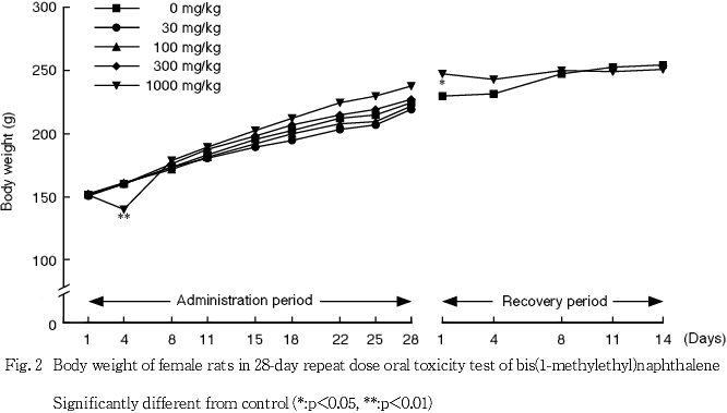 回復期間中には,1000 mg/kg群では対照群と比べて体重に有意差はみられなかった.
