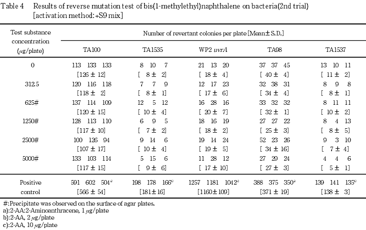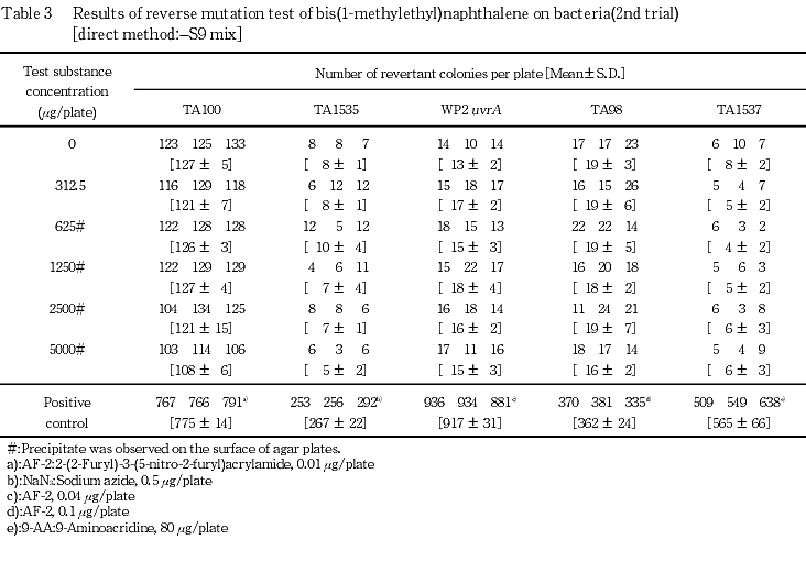 以上の成績から,ビス(1-メチルエチル)ナフタレンの細菌に対する遺伝子突然変異誘発は陰性と判定した.