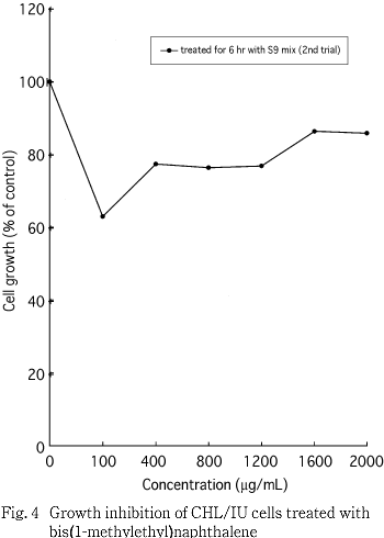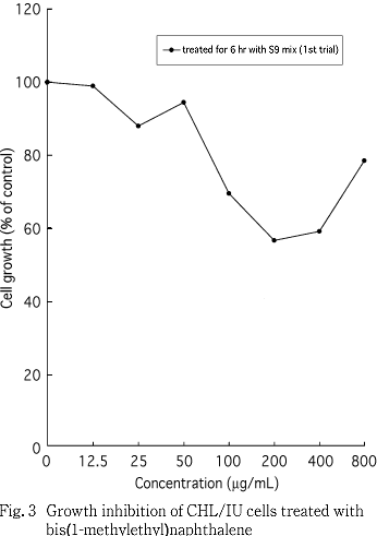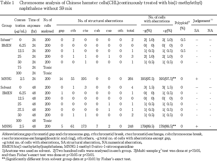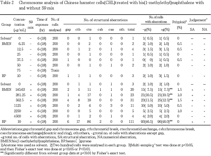 以上の成績から,ビス(1-メチルエチル)ナフタレンは,CHL/IU細胞に対し染色体異常を誘発する(陽性)と結論した.