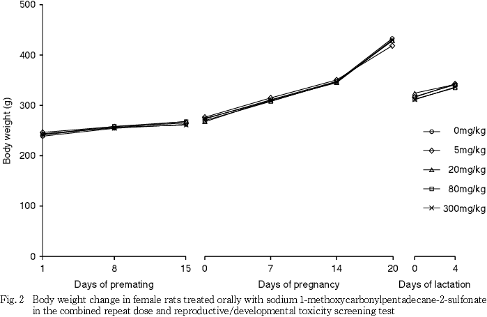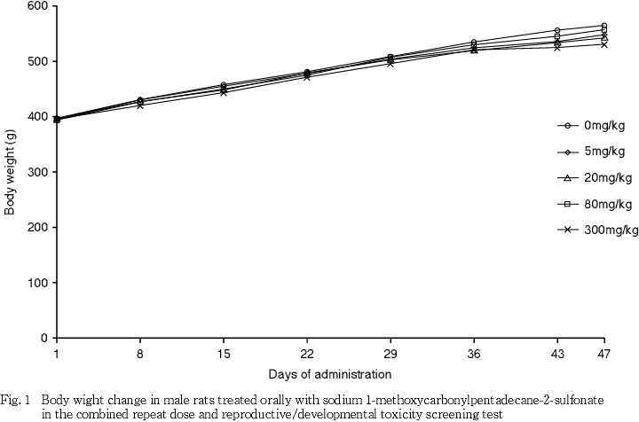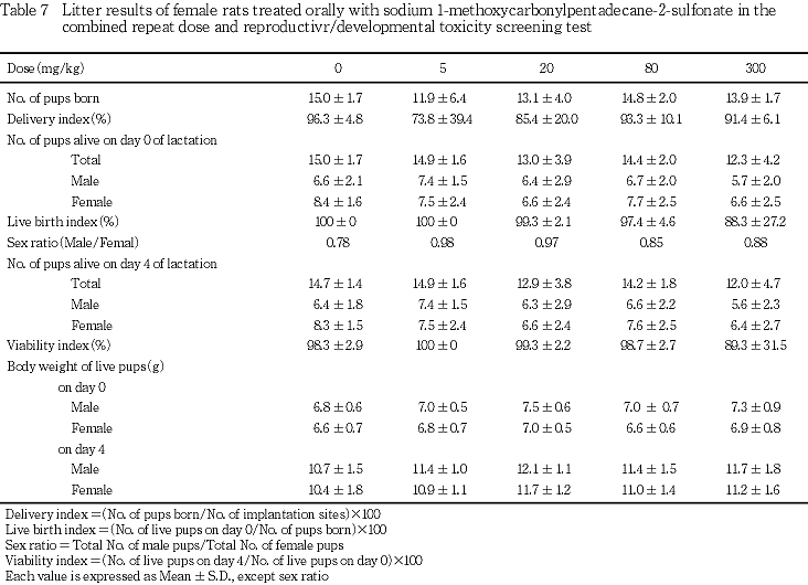 今回,1-メトキシカルボニルペンタデカンスルホン酸ナトリウムについて,反復経口投与毒性・生殖発生毒性併合試験を,SD系〔Crj:CD(SD)IGS〕ラットを用い,0,5,20,80および300 mg/kg/day用量で実施した.動物は1群雌雄各10匹とし,被験物質は交配開始14日前から雄は47日間,雌は分娩後哺育4日(42〜45日間)まで投与した.