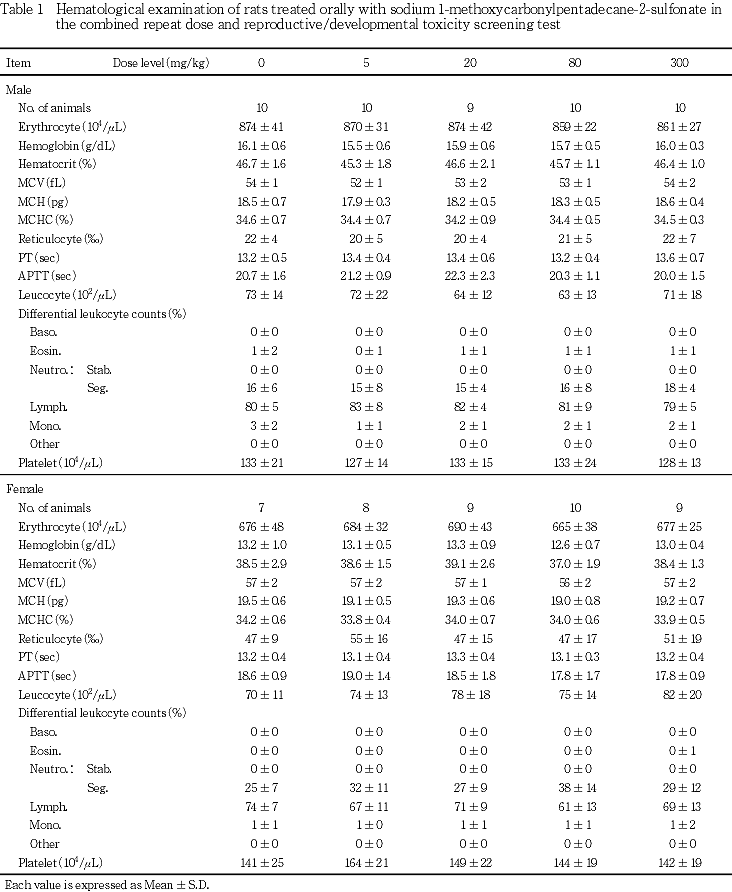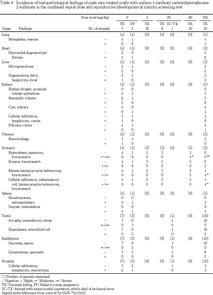 以上の結果から,1-メトキシカルボニルペンタデカンスルホン酸ナトリウムのラットにおける主な反復投与毒性は,前胃に対する影響であった.また,軽度な血液生化学的影響も認められた.無影響量は,雌雄とも,20 mg/kg/dayと判断された.