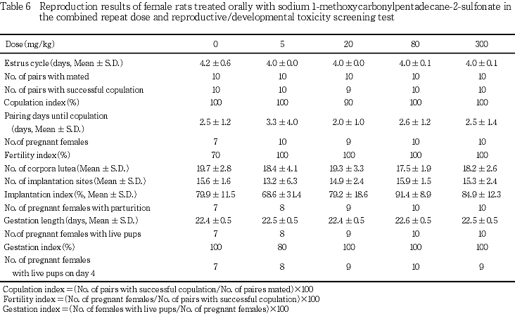 今回の1-メトキシカルボニルペンタデカンスルホン酸ナトリウムのラットへの投与においても,生殖発生毒性は認められなかった.したがって,雌雄親動物の生殖能および児動物の発生に対する無影響量は,300 mg/kg/dayと判断された.
