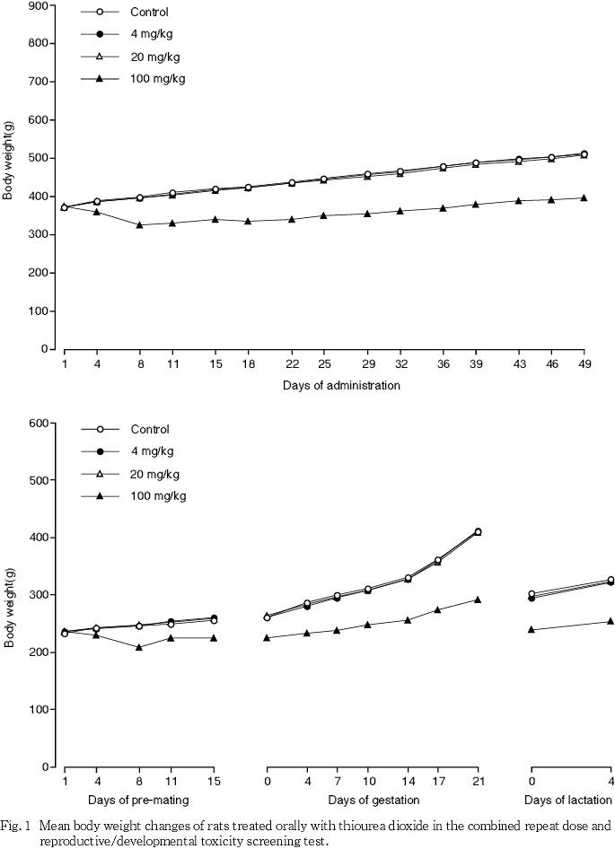 以上のことから,本試験条件下における反復投与毒性に関する無影響量は雌で20 mg/kg/day,雄で4 mg/kg/day,生殖発生毒性に関する無影響量は親動物に対しては雄で100 mg/kg/day,雌で20 mg/kg/day,児動物に対しては20 mg/kg/dayと推察された.
