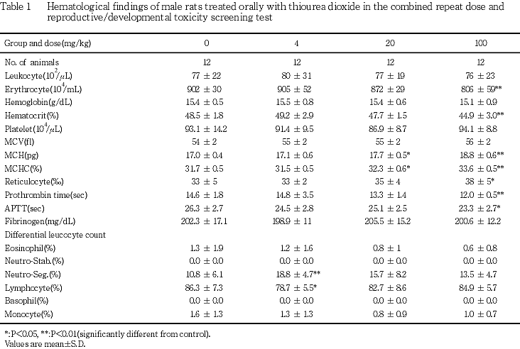 雄の血液学検査では,100 mg/kg群で赤血球数およびヘマトクリット値の減少および網状赤血球数の増加ならびにプロトロンビン時間および活性化部分トロンボプラスチン時間の短縮が認められた.