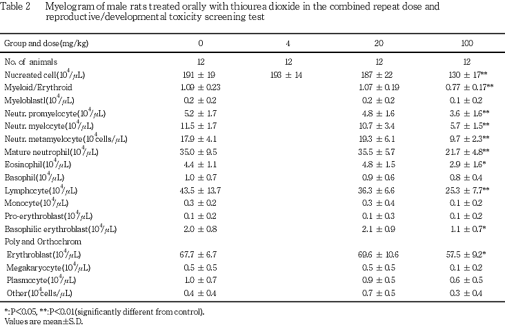 骨髄では,100 mg/kg群の雄11例で大腿骨骨髄の造血低下が認められた.