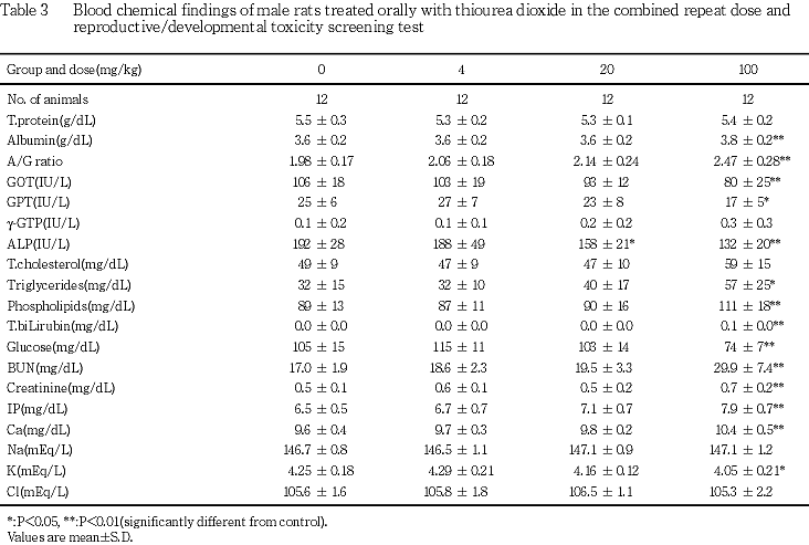 雄の血液生化学検査では,20 mg/kg以上の群でアルカリ性フォスファターゼの減少,100 mg/kg群でアルブミン,A/G比,トリグリセライド,リン脂質,総ビリルビン,尿素窒素,クレアチニン,無機リンおよびカルシウムの増加ならびにグルコ-ス,GOT,GPTおよびカリウムの減少が認められた.