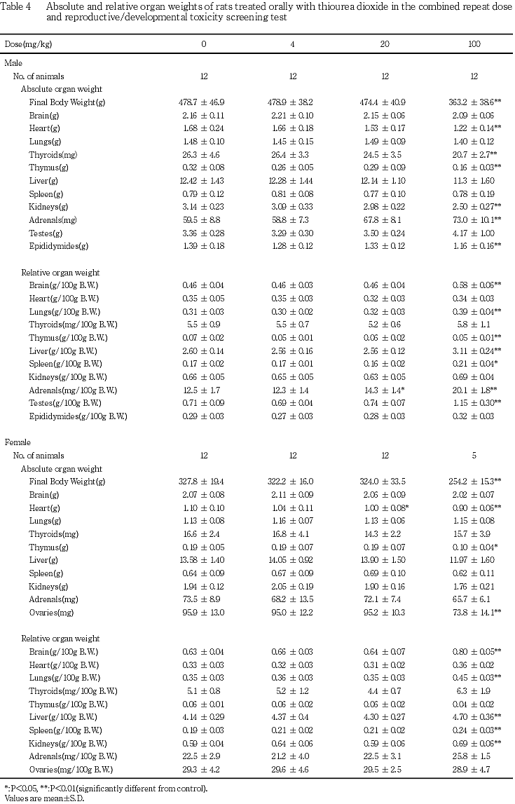 雌では,100 mg/kg群で心臓,胸腺および卵巣の絶対重量の減少,脳,肺,肝臓,脾臓および腎臓の相対重量の増加が認められた.このほか,20 mg/kg群では心臓の絶対重量の減少が認められた.