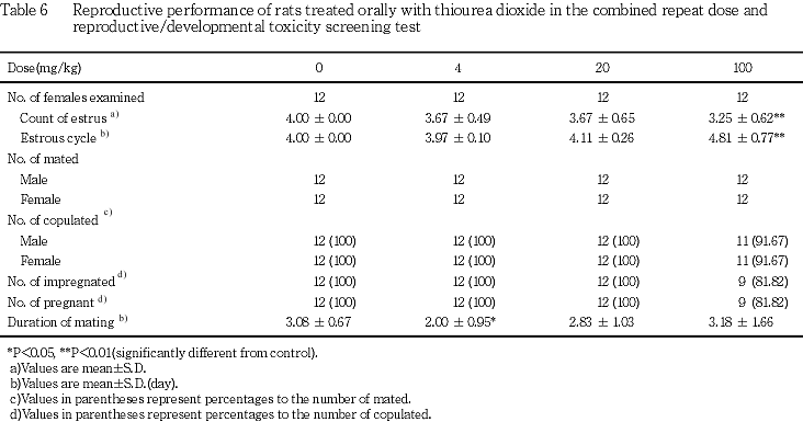 以上のように,雄の生殖機能に被験物質投与の影響はみられなかったが,100 mg/kg群の雌で発情回数の減少および発情周期の延長,黄体数および着床痕数の減少ならびに妊娠期間の延長および出産率の減少傾向がみられ,100 mg/kg群では新生児に対する影響として出産児数,新生児数および出生率の減少または減少傾向が認められたことから,本試験条件下における生殖発生毒性に関する無影響量は,親動物に対しては雄で100 mg/kg,雌で20 mg/kg,児動物に対しては20 mg/kgと推察された.