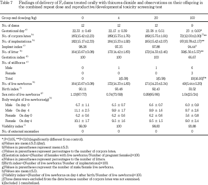 哺育期の検査では,前述した100 mg/kg群の1母動物で児の回集,授乳および保温など哺育行動の不良がみられ,分娩後2日には全児が死亡した.新生児の4日の生存率および体重については,各群とも対照群との間に差は認められなかった.