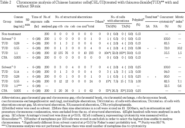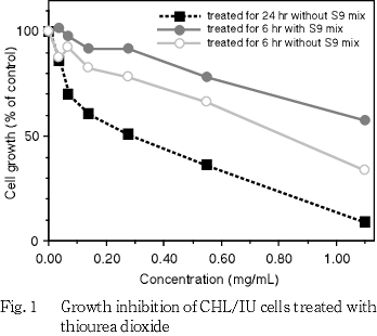 従って,二酸化チオ尿素は,上記の試験条件下で,試験管内のCHL/IU細胞に染色体異常を誘発すると結論した.