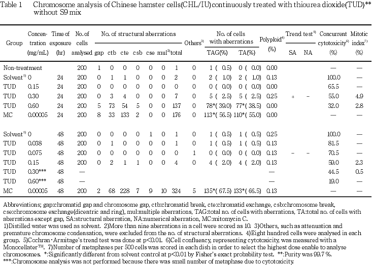 以上の結果より,本試験条件下で二酸化チオ尿素は,染色体異常を誘発する(陽性)と結論した.