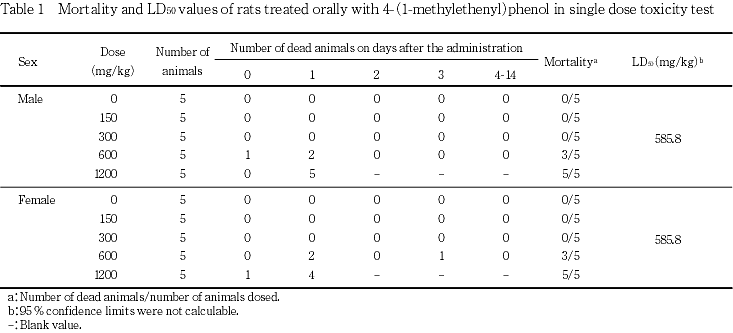 4-(1-メチルエテニル)フェノールの本試験条件下でのLD50値は雌雄とも585.8 mg/kgであった.