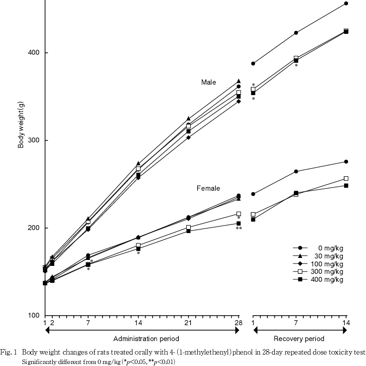 回復期間中では,雄の300 mg/kg投与群で回復1日に有意な低値がみられたが,回復7日以降には有意差は認められなかった.同様に,雄の400 mg/kg投与群で回復1および7日に有意な低値がみられたが,回復14日には有意差は認められなかった.一方,雌の各投与群ともに有意差はみられず,回復期間中の体重増加量および体重増加率にも各投与群の雌雄ともに有意差は認められな かった.